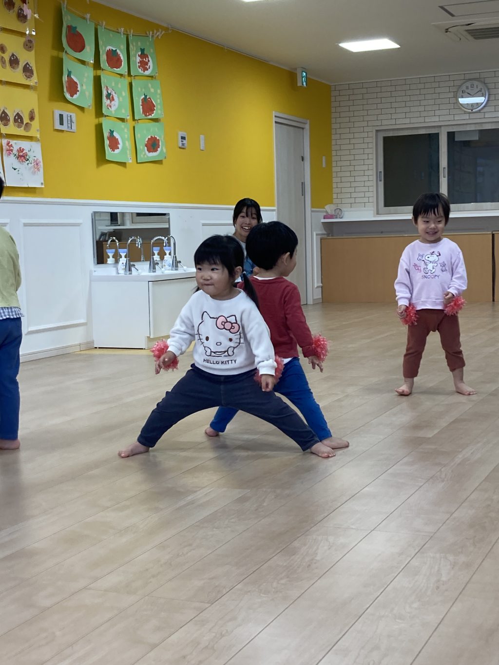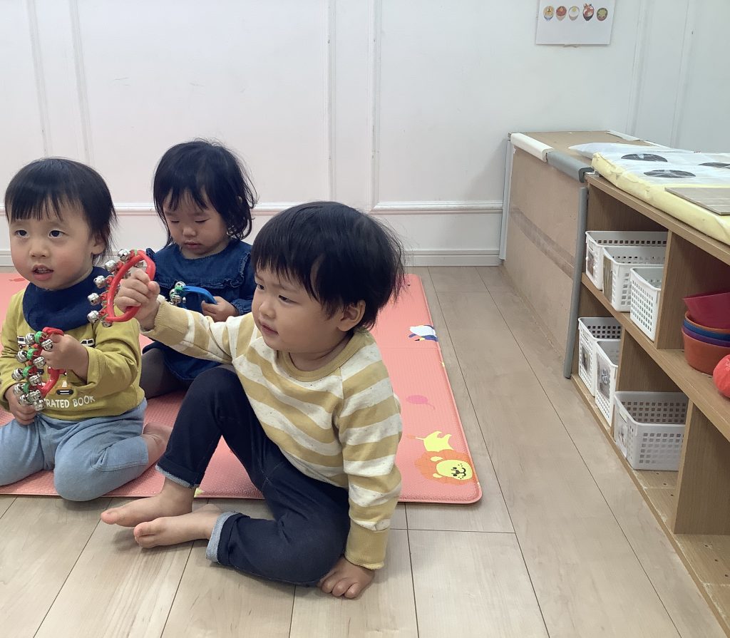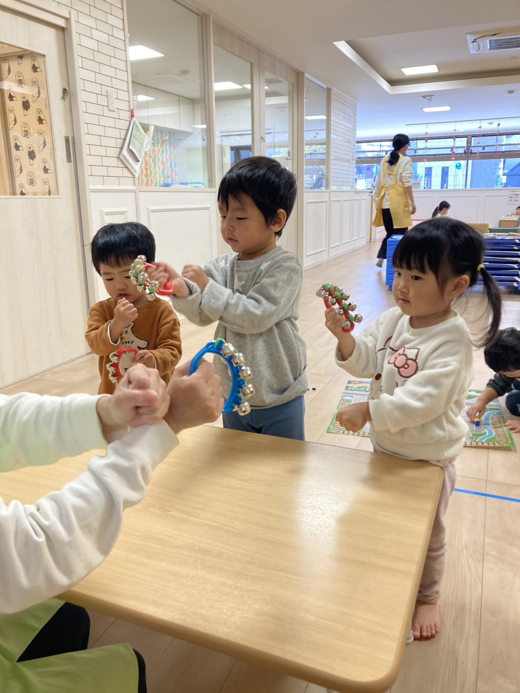今日はみんなで体操をしたり、運動遊びをしたりしました 先生たちとふれあい遊びも楽しいね ねずみ組さんは楽器遊びもしたよ 鈴やタンブリン、ハンドベル音がキレイだねー