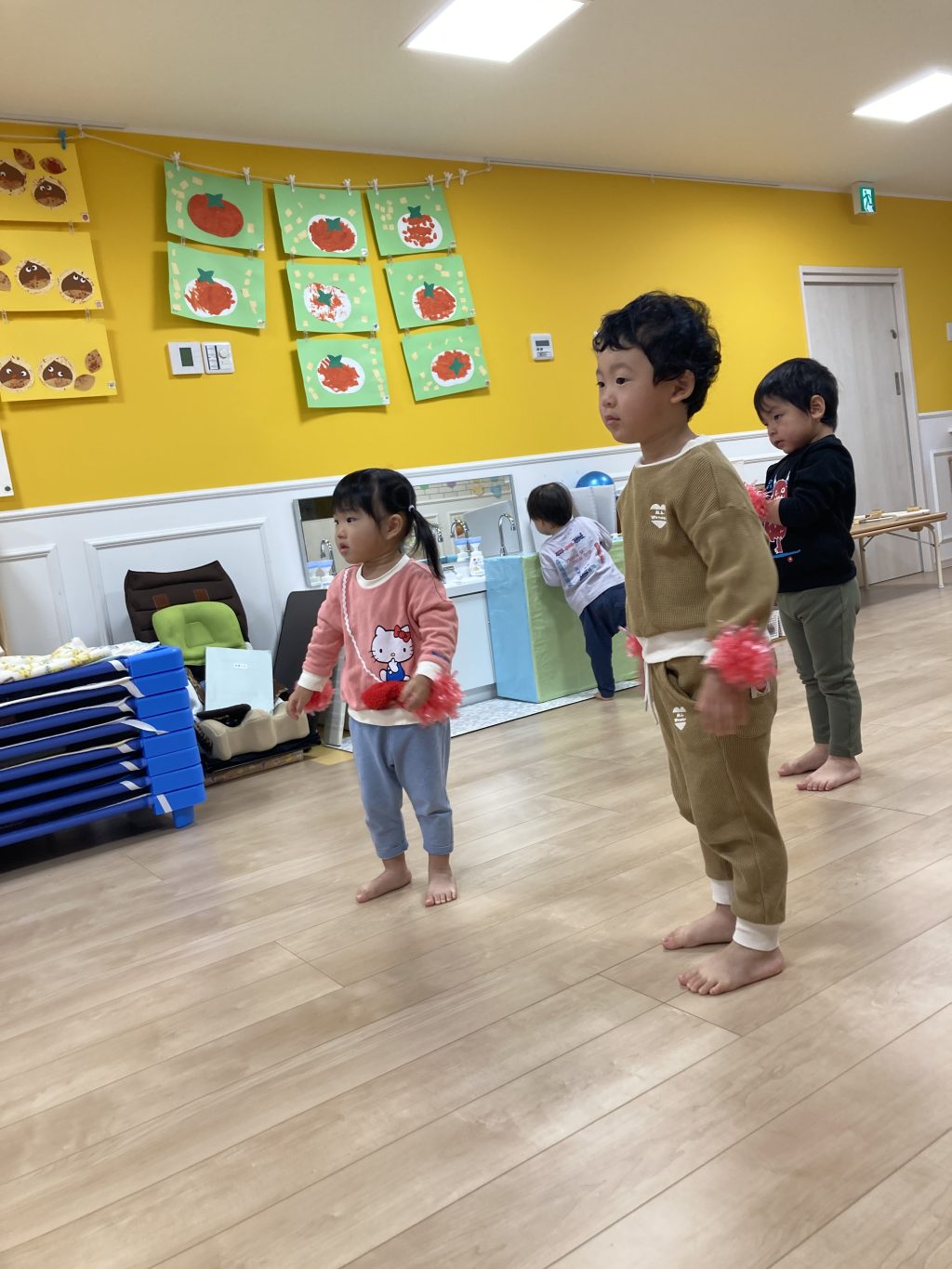 公園に行くと落ち葉やどんぐりがたくさん落ちていて、秋見つけをたくさんしました いろんな色の葉っぱがあったね お部屋遊びの様子 腕にポンポンをつけて体操をしたよ楽しいね りんりん歌を歌いながら鈴を鳴らしてみたよ