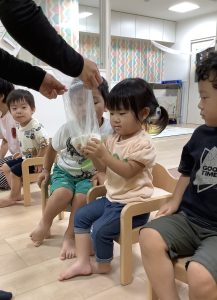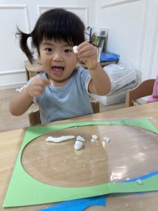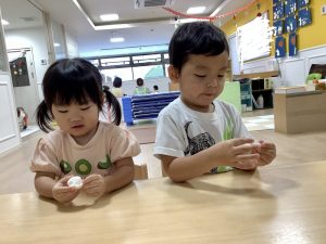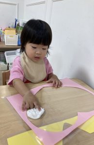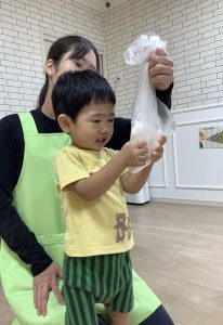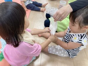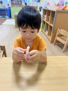 丸めたり、へびに見立てたりしながら遊ぶ子もいました