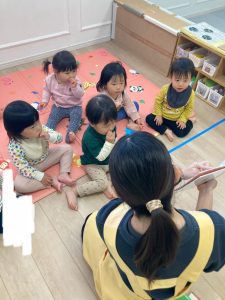 朝の会で絵本を見ていますわーい (嬉しい顔)