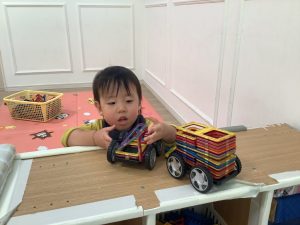 マグフォーマーでは車を作ったり、並べたり様々な遊び方をしていましたほっとした顔
