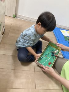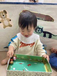 どんぐりに絵の具をつけて転がし、画用紙に模様をつけました