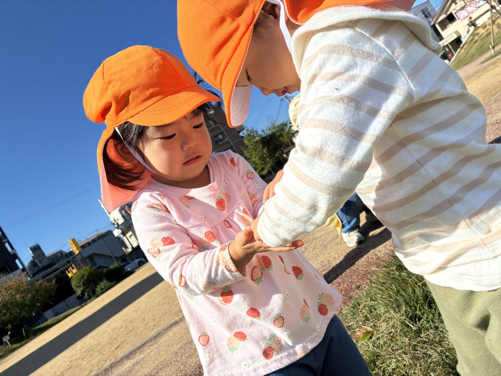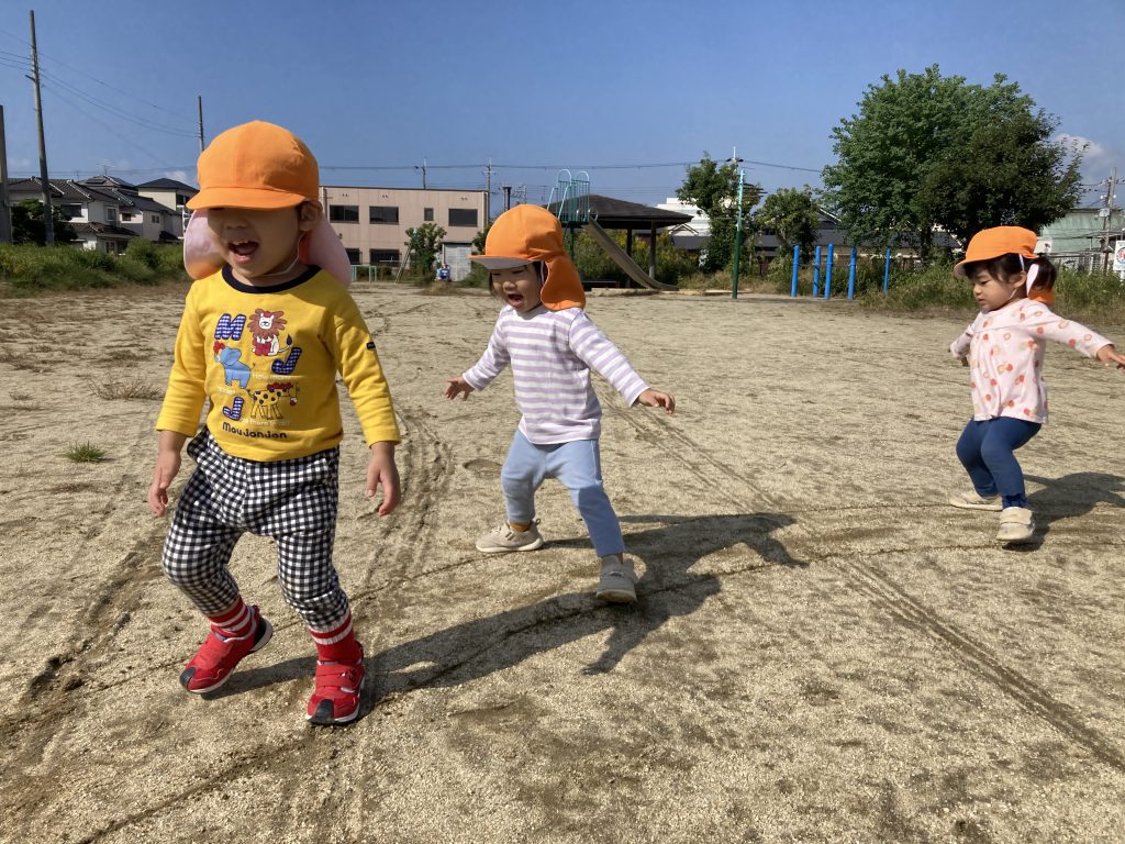 今日も公園でいっぱい遊んだよ よーいどん!! 広い公園でいっぱい走ったよ バッタやトンボにも興味津々の子どもたち くっつき虫もみーつけた 服にいっぱいくっついたよ