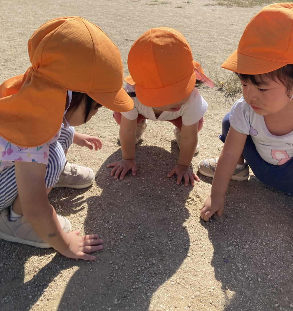 お散歩に行きました 電車が来たよー 公園ではお山を登ったり、どんぐりを探したりしたよ 砂場のある公園に行ったよ 砂山を作ったり、型抜きをしたりしました 大きな砂山作れたね ヘリコプターみーつけたいい表情
