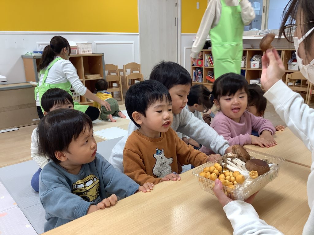 11月の食育はきのこのお話でした 実際にしいたけやえのきなどを触ったり、匂いを嗅いだりしました みんなでしいたけを育てます 興味津々で見ていました 公園では元気いっぱい歩いたり走ったりしました