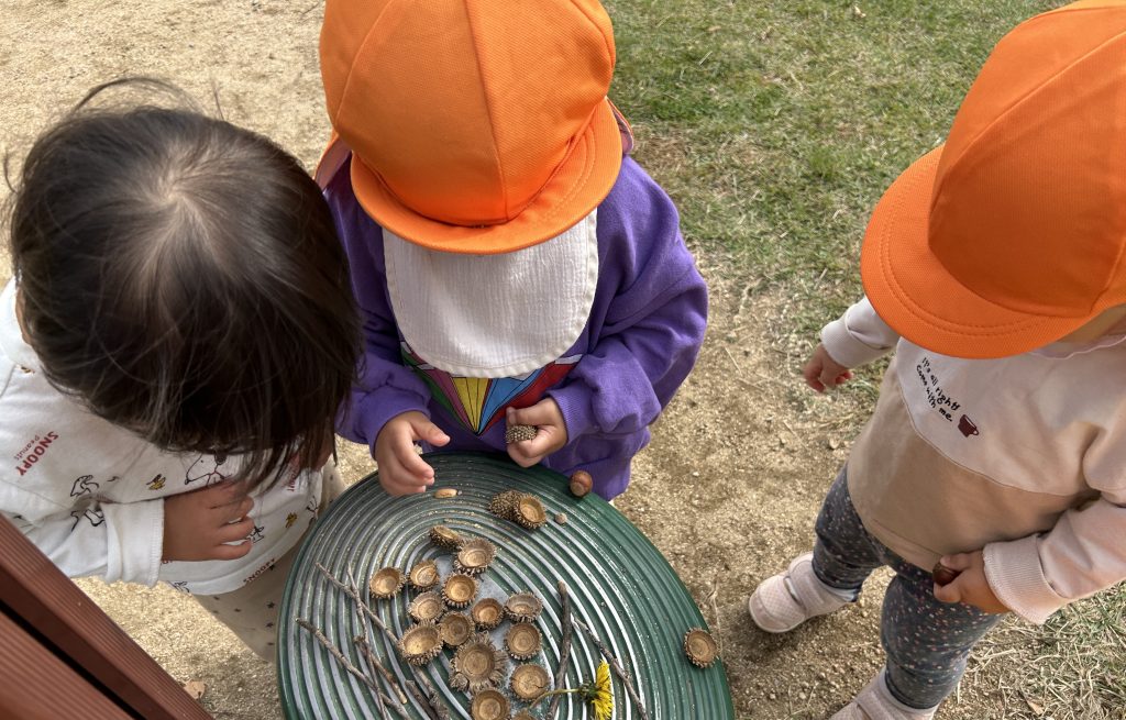 今日も公園でたくさん遊んだよ よーいどん先生の所まで元気いっぱい走ったよ 落ち葉やどんぐり、お花も見つけたよ どんぐりどうぞ 広い公園をたくさん走ったよ お部屋での様子