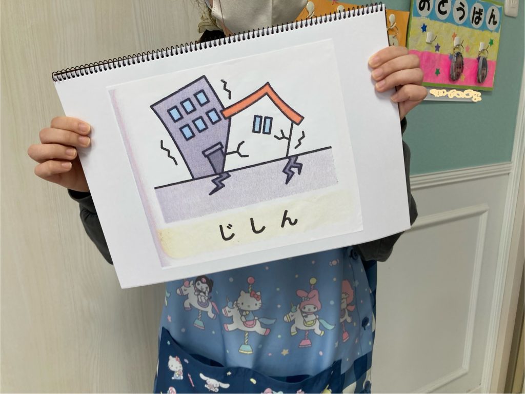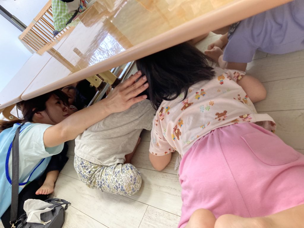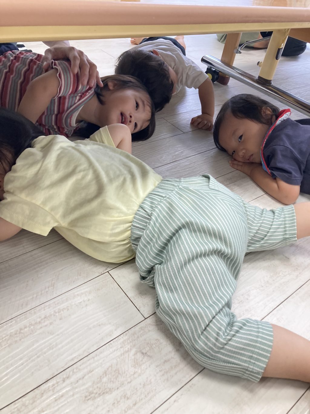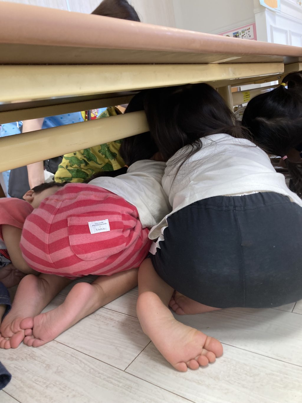実際の避難訓練では、とっても上手に机の下へ隠れ、頭を守ることができました