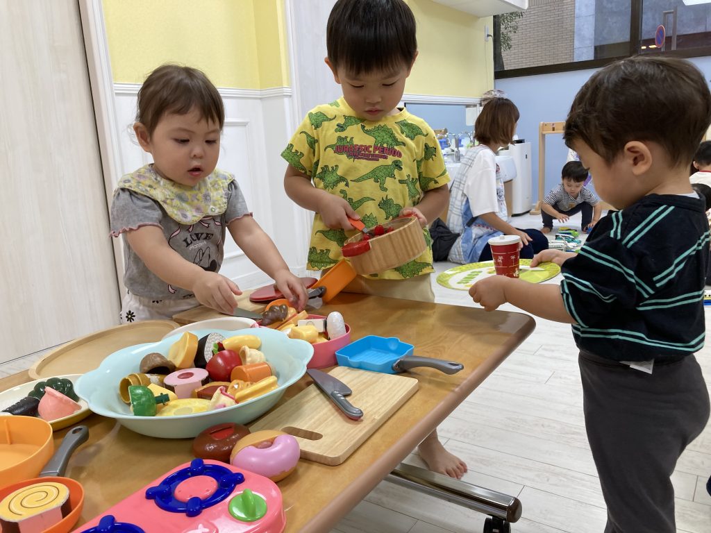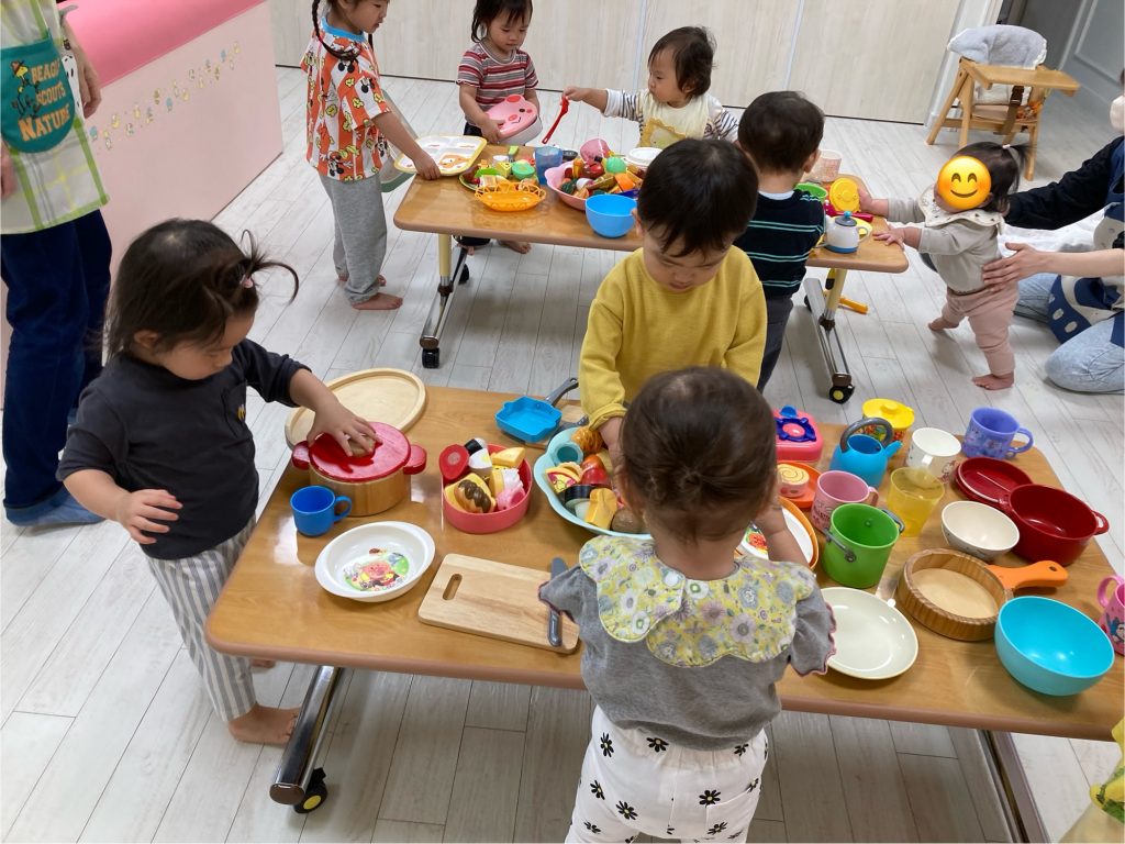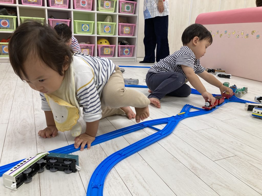 朝の会後は、おままごととプラレールにわかれ子どもたちが好きな遊びに別れて遊びました