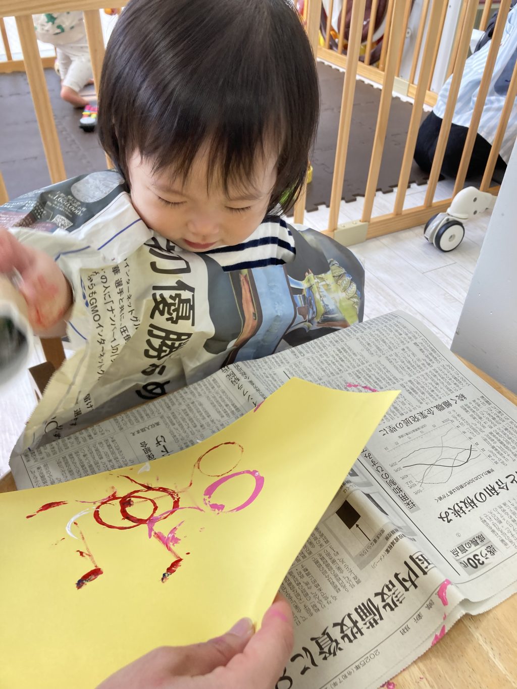 小さいシールも貼れるようになっていて指先の動きも成長してますねほっとした顔指でOK