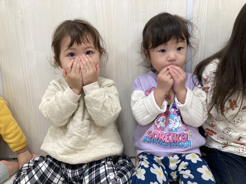 上手におててで口元を覆っていましたほっとした顔