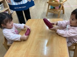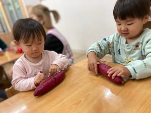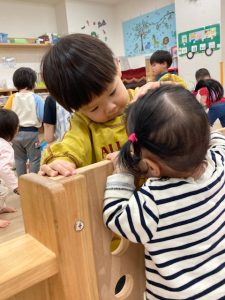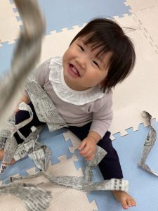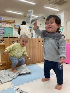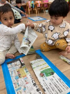 りすさん、ひよこさんは床に貼った新聞紙をびりびり
