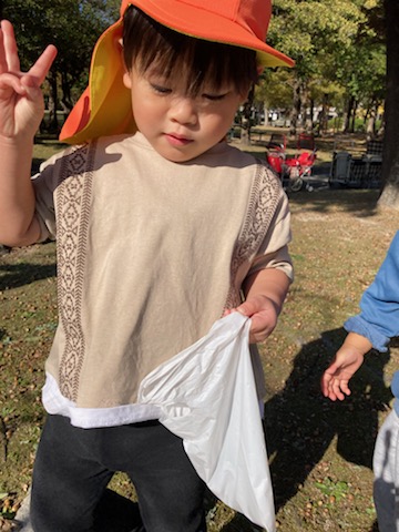 袋を持ってどんぐり拾い