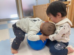 お友だちや先生とポンポンと飛ばしたり上手に蹴ってサッカーのようにしたりして