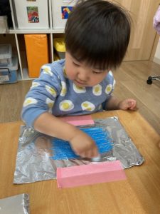 アルミホイルにクレヨンで色を付けます