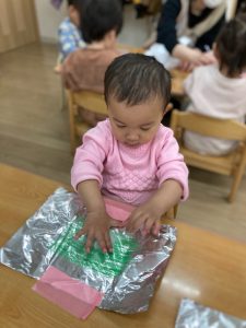 クレヨンが付いたアルミホイルに綿をゴシゴシ