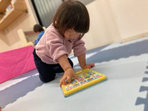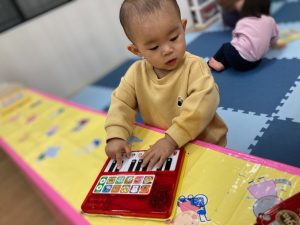 ひよこさんは音のなる玩具で遊んだり