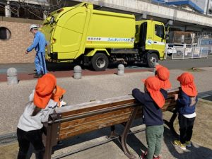 ↓ごみ収集車が来て大興奮!!